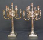 ALLEMAGNE : ROBBE et BERKING : Importante paire de candélabres à neuf lumières en argent, à décor de feuillage, base carrée. Haut : 73 cm. Poids brut environ : 13.200 g (base fourrée en plâtre, un bouquet de lumière bloqué, pas de vis d'une bobèche à ressouder)