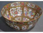 CHINE Canton Important bol en porcelaine à décor polychrome de scènes, personnages et fleurs dans des cartouches XIXème siècle H. : 16.5 cm, D. : 37.5 cm