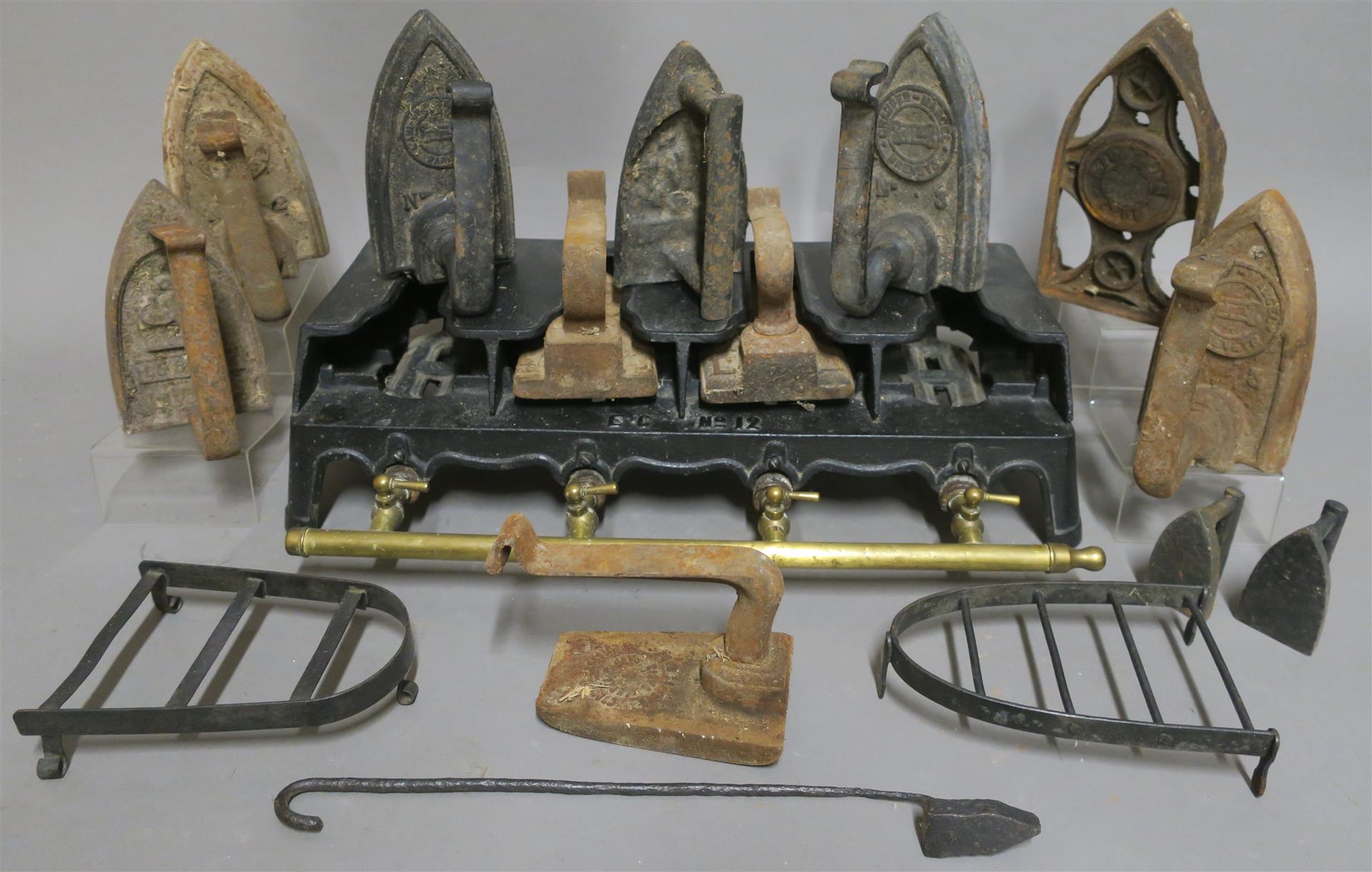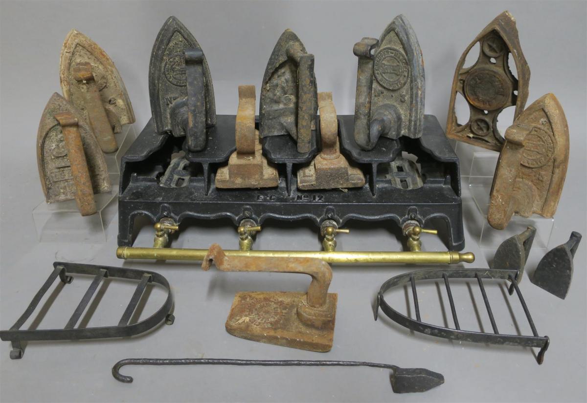 Collection de onze fers à repasser anciens en fonte (toutes tailles), un réchaud en fonte à gaz marqué EC n°12, deux porte-fer