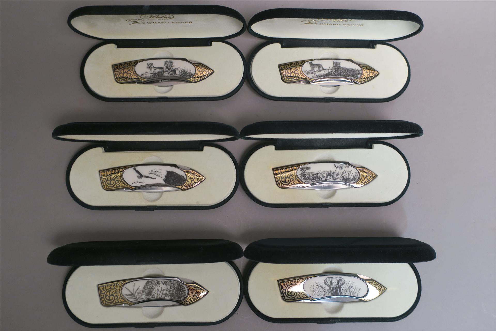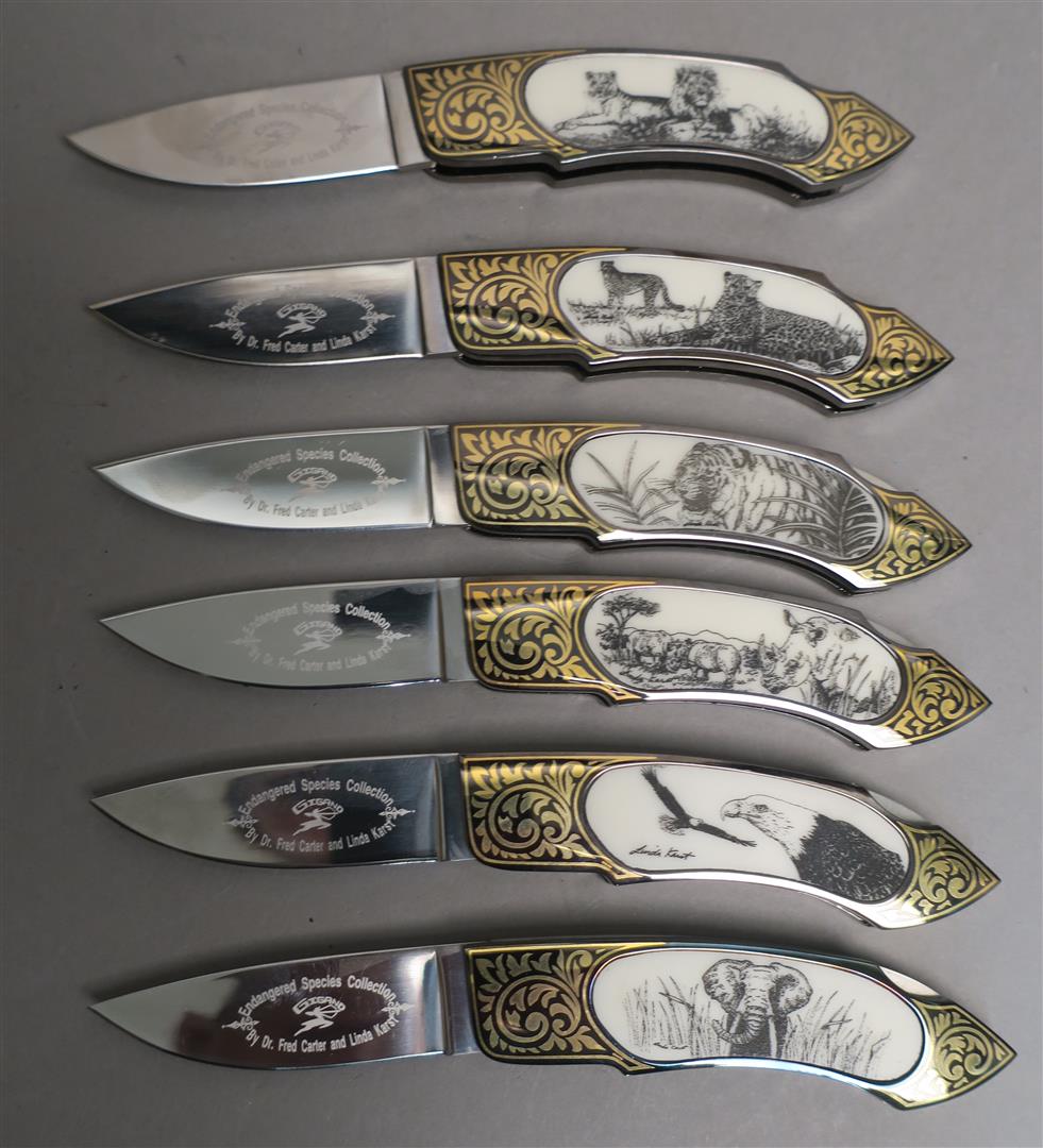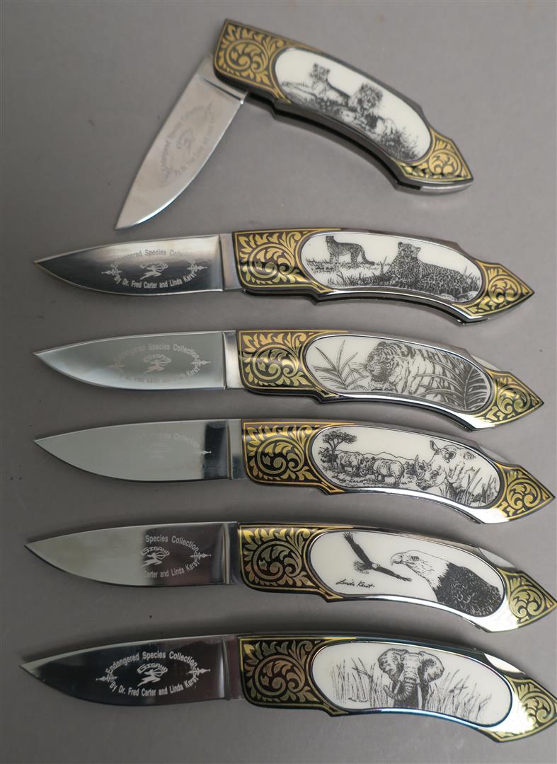 GIGAND KNIVES - Collection de 6 couteaux pliant en acier à pompe arrière, les manches damasquinés avec incrustation de plaquettes en résine gravées sur le thème des Espèces menacées "Endangered species" designed by Fred Carter & Linda Karst. Collection constituée en 2015, achat 42 pièce.
