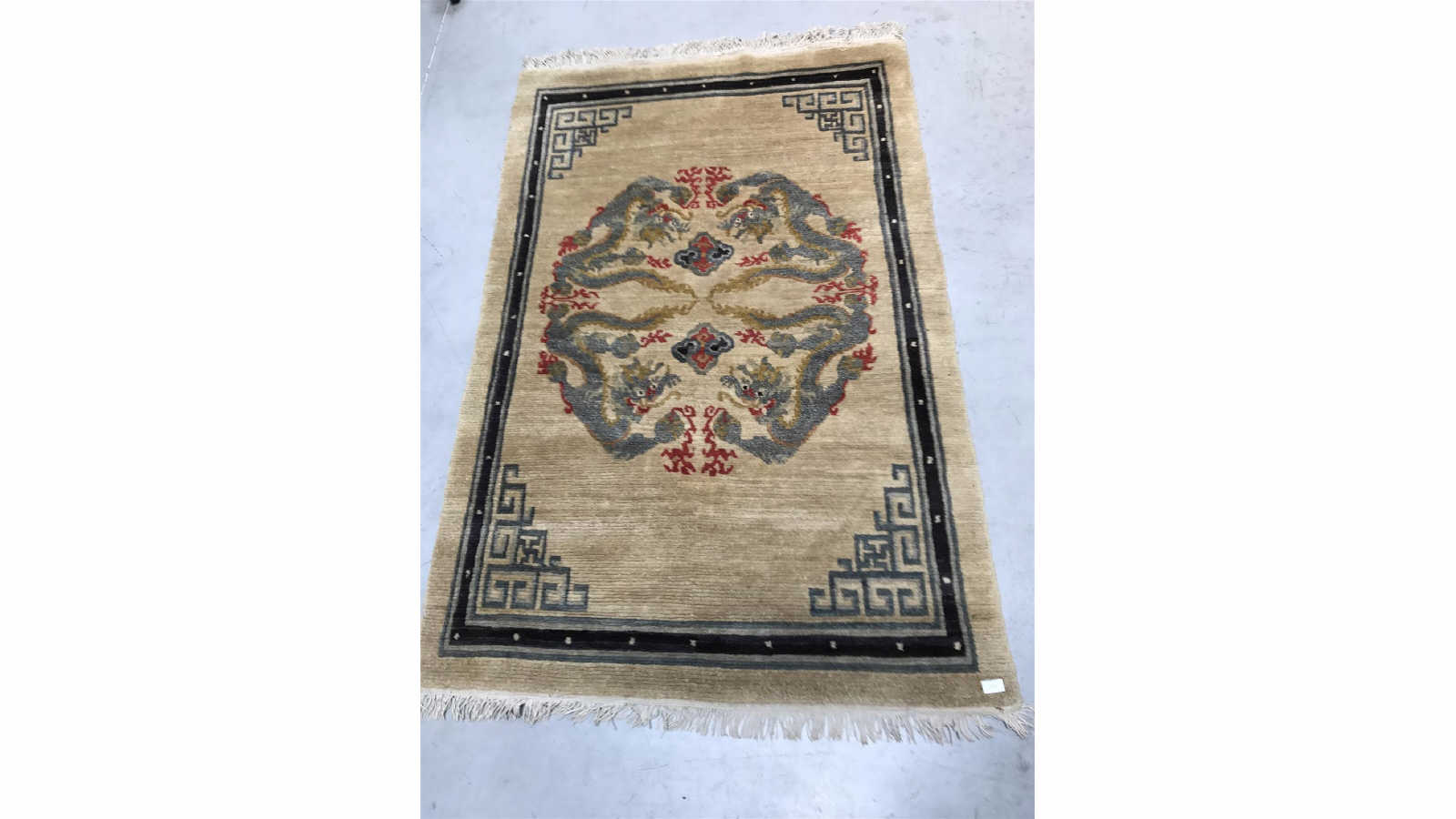 Ancien TAPIS chinois à décor de dragon sur fond beige. 187 x 123 cm.