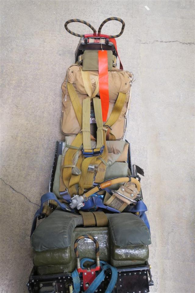 Siège éjectable Martin Baker MK BRM 4 de mirage V siège ayant subit l'éjection (baquet voilé légèrement enfoncé, manette latérale droite à refixer) Complet avec son équipement, boucle de harnais voilés. Lot vendu uniquement à titre d'objet de collection, et en aucun cas en vue d'une utilisation pour laquelle la Sarl Boisseau-Pomez décline toutes responsabilité