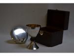 Maurice CHERET Calice et sa patène en argent martelé et vermeil, le fût annelé en bois et frise perlée Poinçon Minerve Orfèvre : Maurice Chéret H. : 17 cm, poids brut : 776 gr (dans son écrin d'origine signé)