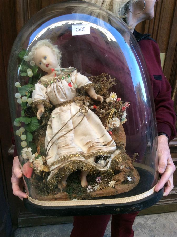 Bel enfant Jésus en cire, yeux verre bleu, bouche ouverte rangée de dents, cheveux mohair blonds, vêtement d'origine soie écrue fusée à galons dorés, fleurettes tissu, raisin, ... sous son globe en verre d'origine. Ht: 43 cm, 50 cm avec le globe. Le tout en l'état.