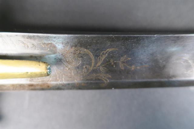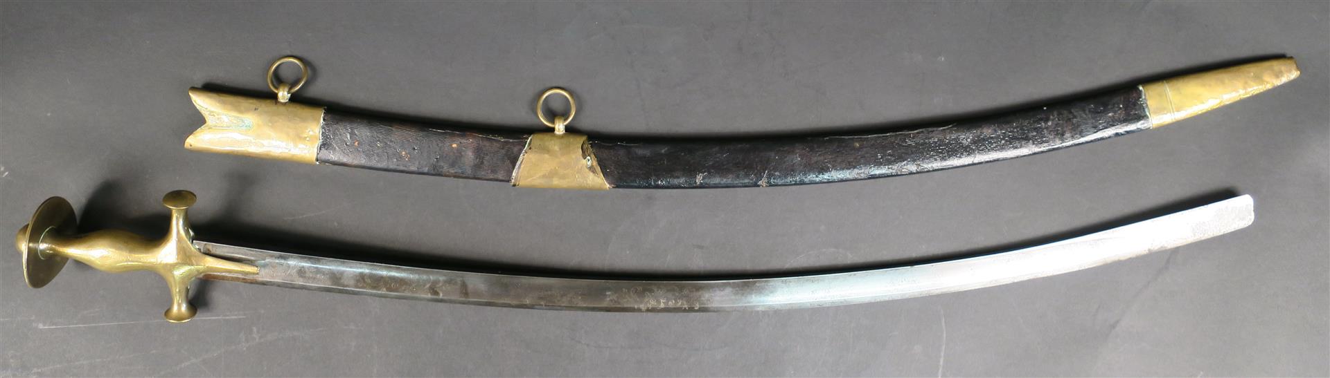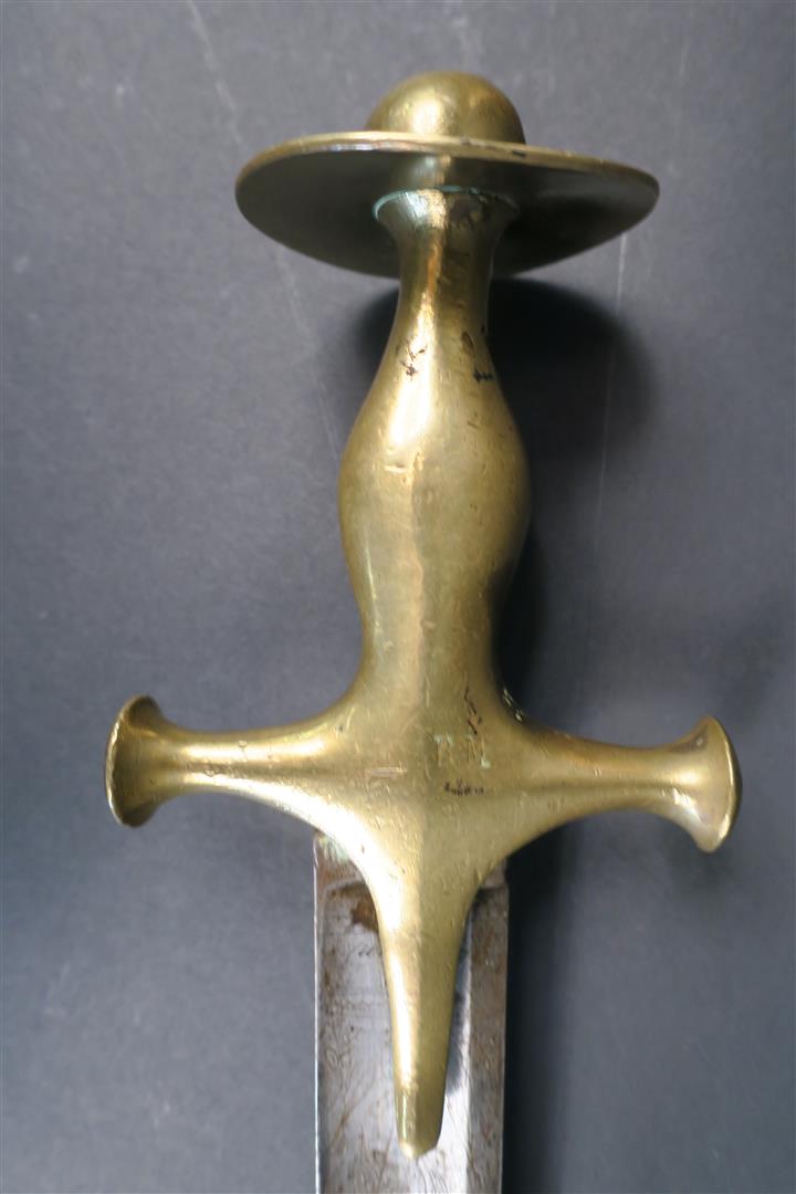 Sabre indien dit Talwar à poignée en laiton, lame courbe (rapportée) gravée de motifs floraux, avec fourreau à garniture en laiton