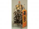 Pendule de chambre à poids en fer avec réveil signé 15 EL 89 = Erhard Liechti Winterthur 1589 Cadran en fer peint(peinture rafraîchie), avec disque séparée pour le réveil et phases de la lune par guichet, 1 aiguille en fer avec symboles pour soleil et lune en laiton, mouvement en fer à 4 piliers 8 traverses, chaque pilier avec 2moulures à œilleton et empattement carré; 2corps de rouage, échappement à verge et foliot annulaire très tôt converti en verge horizontale par une système où le mouvement de la roue de rencontre, au lieu d’être découpé et contrôlé par un balancier, est découpé par un oscillateur muni de 2 petits poids, solidaire à angle droit avec l’axe de la verge ; réveil à fiche, roue de compte à l’extérieur, sonnerie et réveil sur timbre. H. 38.5cm.