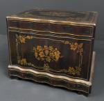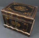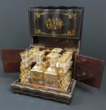 Cave à liqueur d'époque Napoléon III en bois noirci incrusté de laiton à décor de pampres de vigne et grappes de raisin, intérieur comprenant trois flacons carrés et douze verres à liqueur à pied carré en cristal doré (petite égrenure à l'angle d'un pied) (manque quatre verres ; un quatrième flacon avec un col cassé manquant)