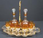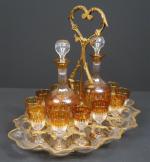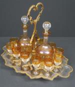 Service à liqueur d'époque Napoléon III, le plateau mouvementé en verre moulé avec un panier adhérent en métal doré comprenant deux carafes et douze verres à liqueur en cristal taillé doublé orange (rapportés)