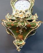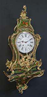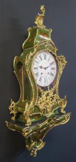Cartel d'applique violonné et son socle d'époque Louis XV en verni Martin à décor polychrome de fleurs sur fond vert, ornements de bronze doré à décor d'une chimère, fleurettes et rocailles, cadran à compartiments en émail et platine arrière signés J.P COURTOIS à Paris, la caisse estampillée J. GOYER et JME. Haut. totale : 1,26 m (Jean GOYER, reçu maître en 1760) (restaurations, petites reprises à l'émail du cadran)