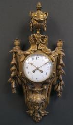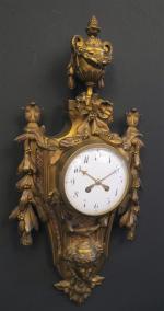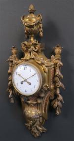 Cartel d'applique de style Louis XVI en bronze à décor de mascaron et guirlandes de laurier nouées, surmonté d'une urne, ép. fin XIX's. Haut : 63 cm (éclats à l'émail ,aux trous de remontage, manque la clé)