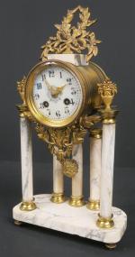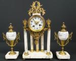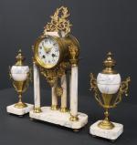 Garniture de cheminée de style Louis XVI en marbre et bronze, comprenant une pendule portique à cinq colonnes. Haut : 40 cm, et une paire de cassolettes. Haut : 25 cm