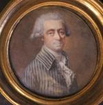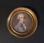 Miniature ronde : Portrait d'homme à la veste à rayures, faite par Madame DESMIERS (?, )d'après Louis-Marie SICARDY, le 8 octobre 1790, ép. fin XVIII's. Diam : 6,5 m, cadre en bois cerclé de laiton (bosse)