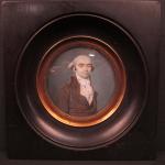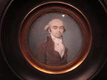 Miniature ronde fin d'époque XVIII's représentant un homme en habit à rayures. Diam : 5,7 cm, cadre en bois noirci