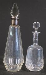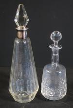 Deux flacons en cristal, l'un à pans coupés et col en métal argenté. Haut : 36 cm, l'autre faceté. Haut : 27 cm