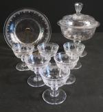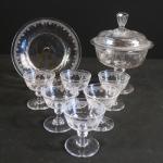 Service à cerises à l'eau de vie comprenant un bocal à cerises couvert sur son présentoir et six petits verres à cerises en cristal gravé de palmettes