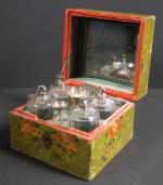 Coffret à parfum en vernis Martin à décor polychrome de fleurs sur fond vert, l'intérieur du couvercle foncé de glace, contenant quatre flacons en verre à pans coupés et bouchons argent, une petite timbale tulipe, un entonoir et un platau à bord polylobé en argent, ép. XVIII's. Haut : 12 cm - Larg : 16 cm - Prof : 14,5 cm (manque au décor du coffret, manque au bord de la timbale)