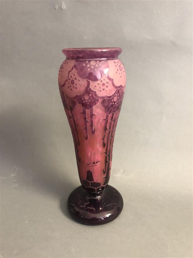 Vase de forme balustre sur piédouche en verre gravé à l'acide à décor de fleurs stylisées violettes sur fond rose. Modèle " Eglantines ". Signé des deux. H. 28 cm