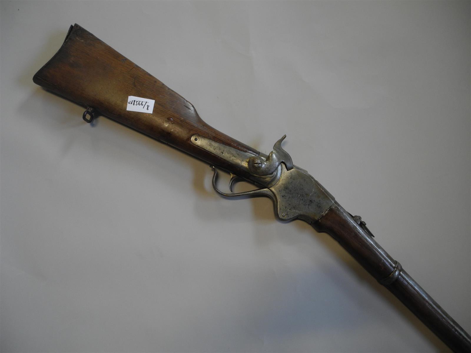 Fusil Spencer Modèle 1860 à répétition manuelle, à canon portant hausse et guidon, mécanisme à percussion annulaire, platine de type " arrière ", le bloc culasse est abaissé par le levier de sous-garde pour le chargement de la munition, monture unie en deux parties, garnitures en fer. Matricule 101966. Longueur : 120 cm. États-Unis d'Amérique, dernier tiers du XIXe siècle. PM