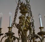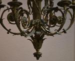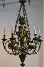 Lustre dit "Arabesque à enfants musiciens" en bronze ciselé et doré, à six bras de lumière en enroulements feuillagés retenus par des chaînes, le fût central à cannelures et feuilles d'acanthe terminé par une grenade en partie basse, à cannelures en spirales et flamme en partie haute