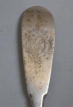 CUILLERE A RAGOUT en argent, modèle uniplat, la spatule gravée d'armoiries sous une couronne de marquis Saint Malo, 1770-77 Maitre orfèvre: Joseph Louis BENNABEN, reçu en 1748 L.: 35 cm Poids: 176 gr