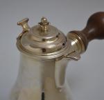 VERSEUSE en argent uni, reposant sur trois pieds en enroulement, le bec verseur à clapet, le frétel en fruit, le manche en bois tourné