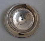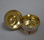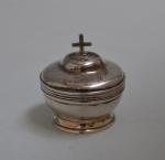 CUSTODE ou PYXIDE en argent uni, reposant sur un petit piédouche mouluré de filets en rappel sur la bordure du couvercle, ce dernier surmonté d'une croix, l'intérieur vermeillé