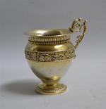 TASSE sur piédouche en vermeil à décor de frises de feuilles lancéolées, de perles, de feuilles de vigne, l'anse appliquée Paris, 1819-1838 H.: 11.5 cm Poids: 218 gr