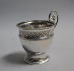 TASSE en argent reposant sur un piédouche, à décor de frises de perles, feuilles lancéolées et motifs ornementaux, anse latérale Paris, 1819-1838 H.: 11 cm Poids: 166 gr