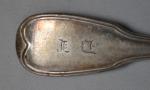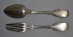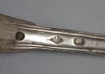 COUVERT en argent, modèle filets, chiffré Paris, 1819-1838 Orfèvre: Edmond JAMET (1831-1847) Poids: 176 gr (usures au fourchon)