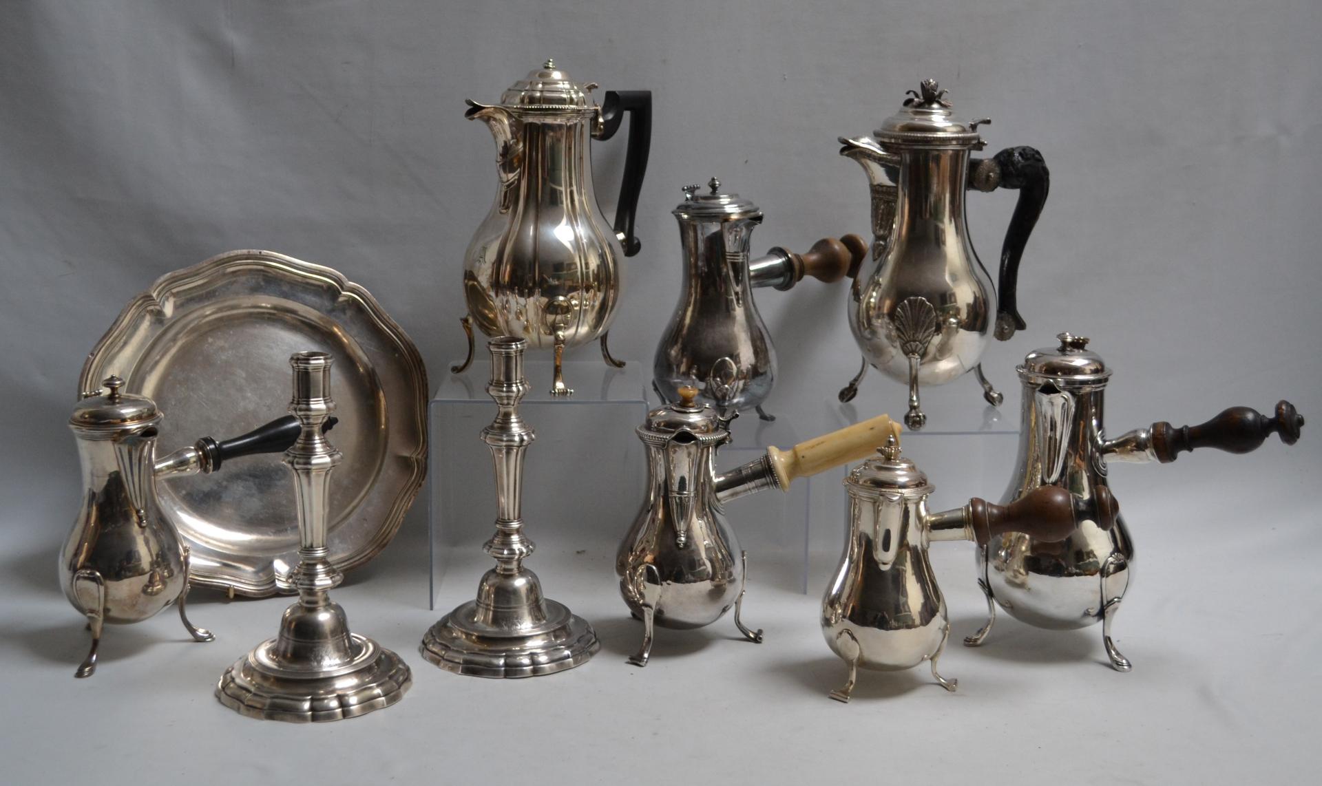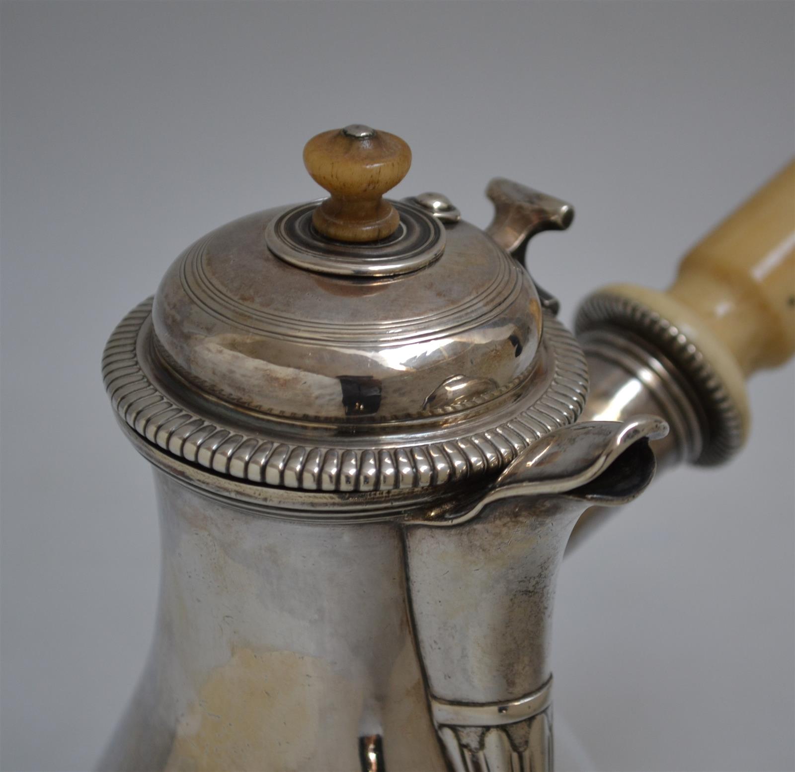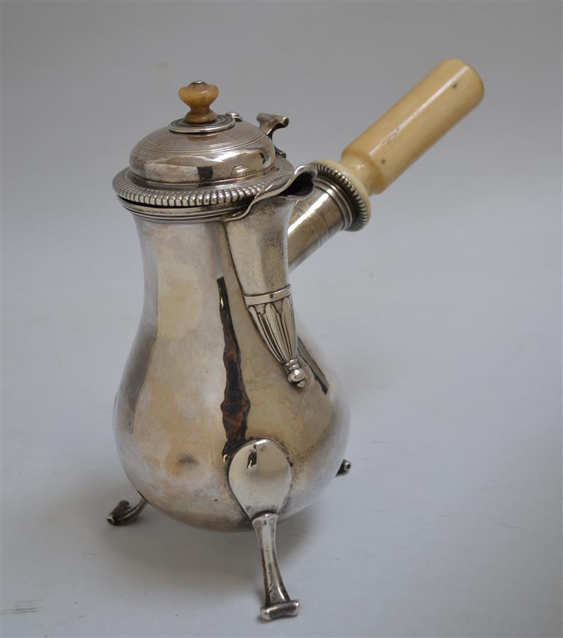 CHOCOLATIERE en argent uni, reposant sur trois pieds en enroulement, le bec verseur cannelé en bec de canard, le frétel et le manche en os
