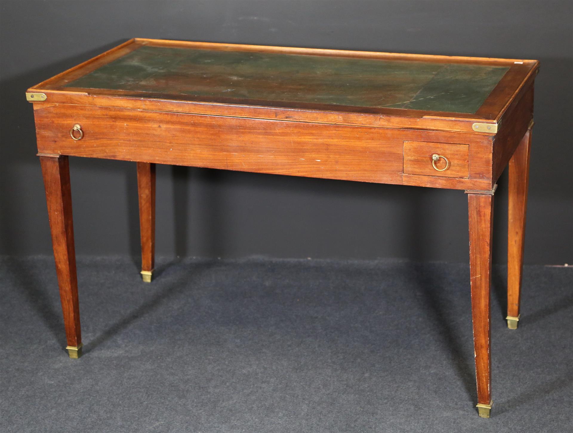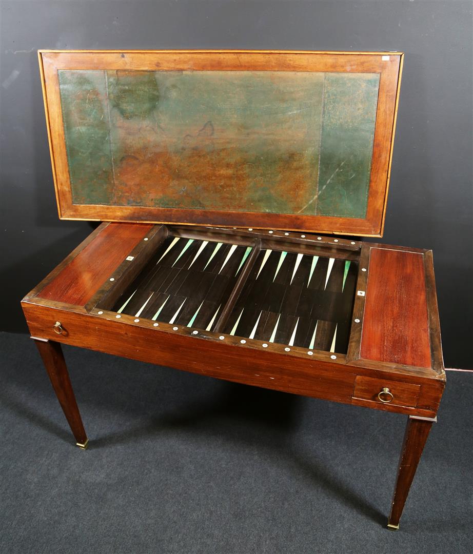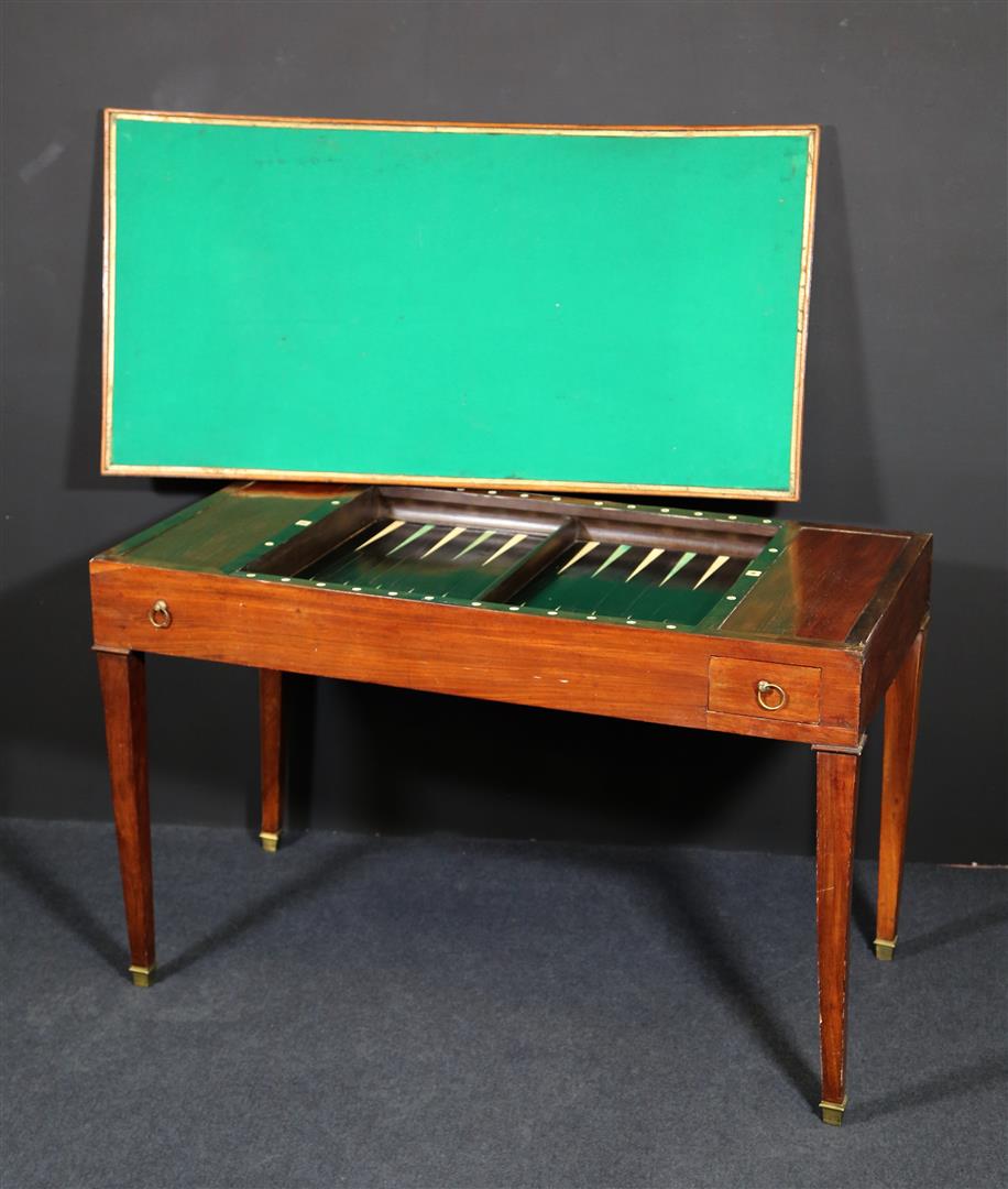 Table tric-trac d'époque Directoire en placage d'acajou, plateau réversible gainé de cuir et d'un feutre vert, intérieur en placage d'ébène et d'ivoire et d'os teinté, deux petits tiroirs latéraux, pieds gaines. Long : 1,13 m - Prof : 0,57 m - Haut : 0,73 m (petites restaurations)