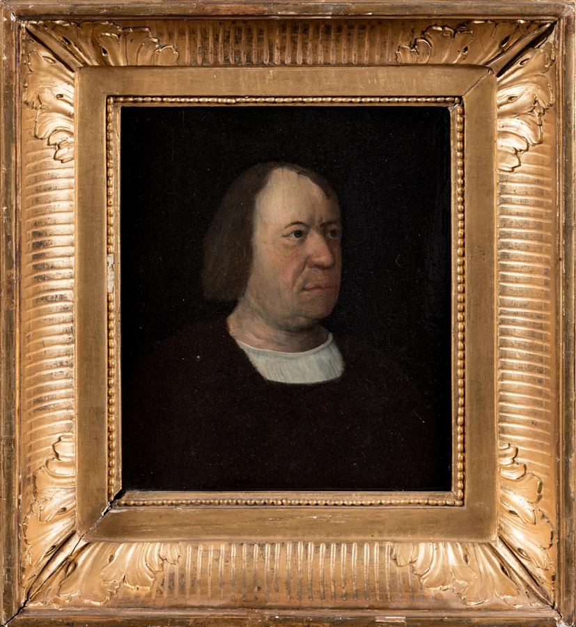 ECOLE FLAMANDE DU XIXE SIECLE, dans le goût du XVIe. "Portrait d'homme de trois-quarts". Panneau de chêne parqueté. 26 x 21 cm. Restaurations. RM