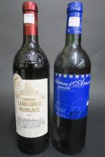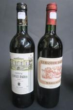 BORDEAUX ROUGE. Lot de 4 Bouteilles comprenant: 1 Blle CH. LEOVILLE-BARTON, SAINT-JULIEN 1997 R, 2e cru classé - 1 Blle CH. D'ARSAC, cru bourgeois, MARGAUX 1996 R - 1 Blle CH. LABASTIDE DAUZAC, MARGAUX, 2002 R - 1 Blle ch. LABEGORCE, cru bourgeois, MARGAUX, 2003 R