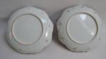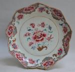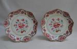 CHINE Compagnie des Indes Paire de plats ronds en porcelaine à décor émaillé famille rose de pivoines, l'aile en forme de fleur de lotus XVIIIème, époque Kien Long D.: 36.5 cm