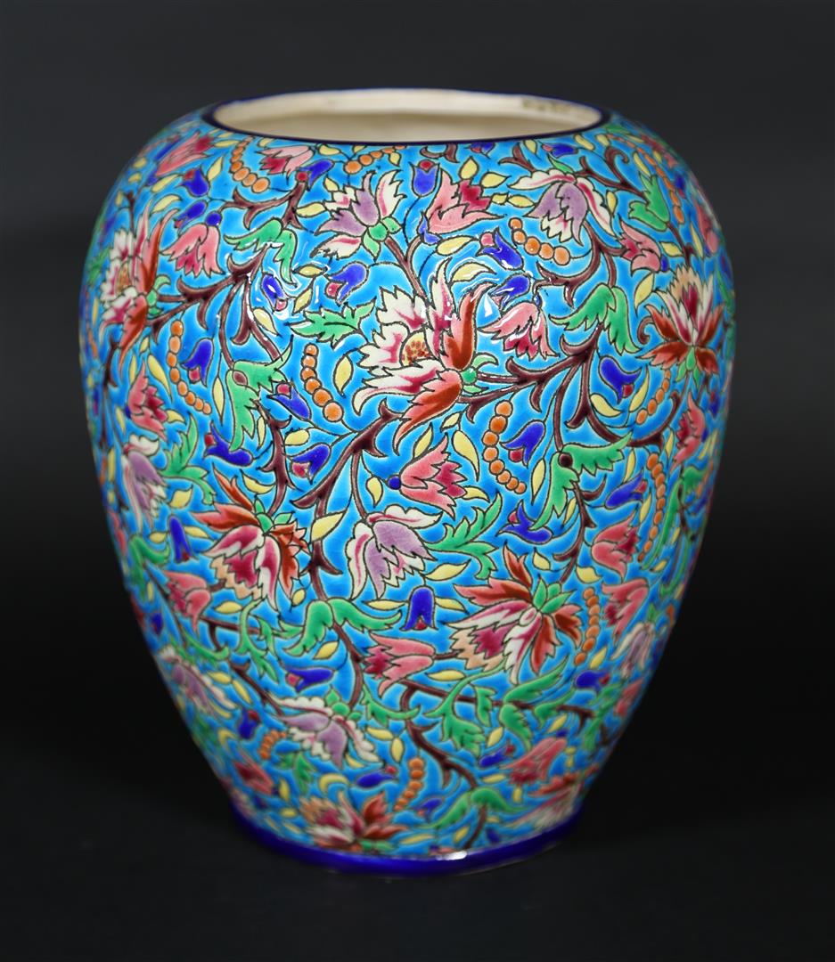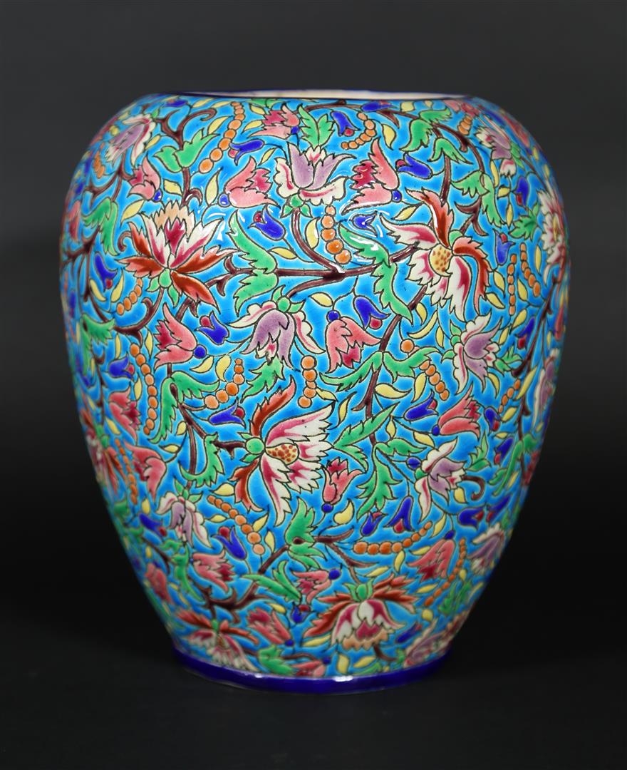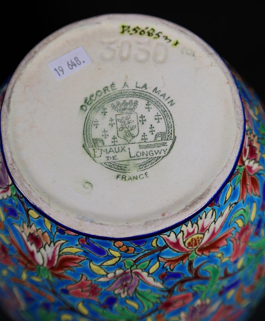 LONGWY : Vase ovoïde à décor en émaux polychromes de branches fleuries sur fond bleu (décor n°5685), cachet. Haut : 24 cm