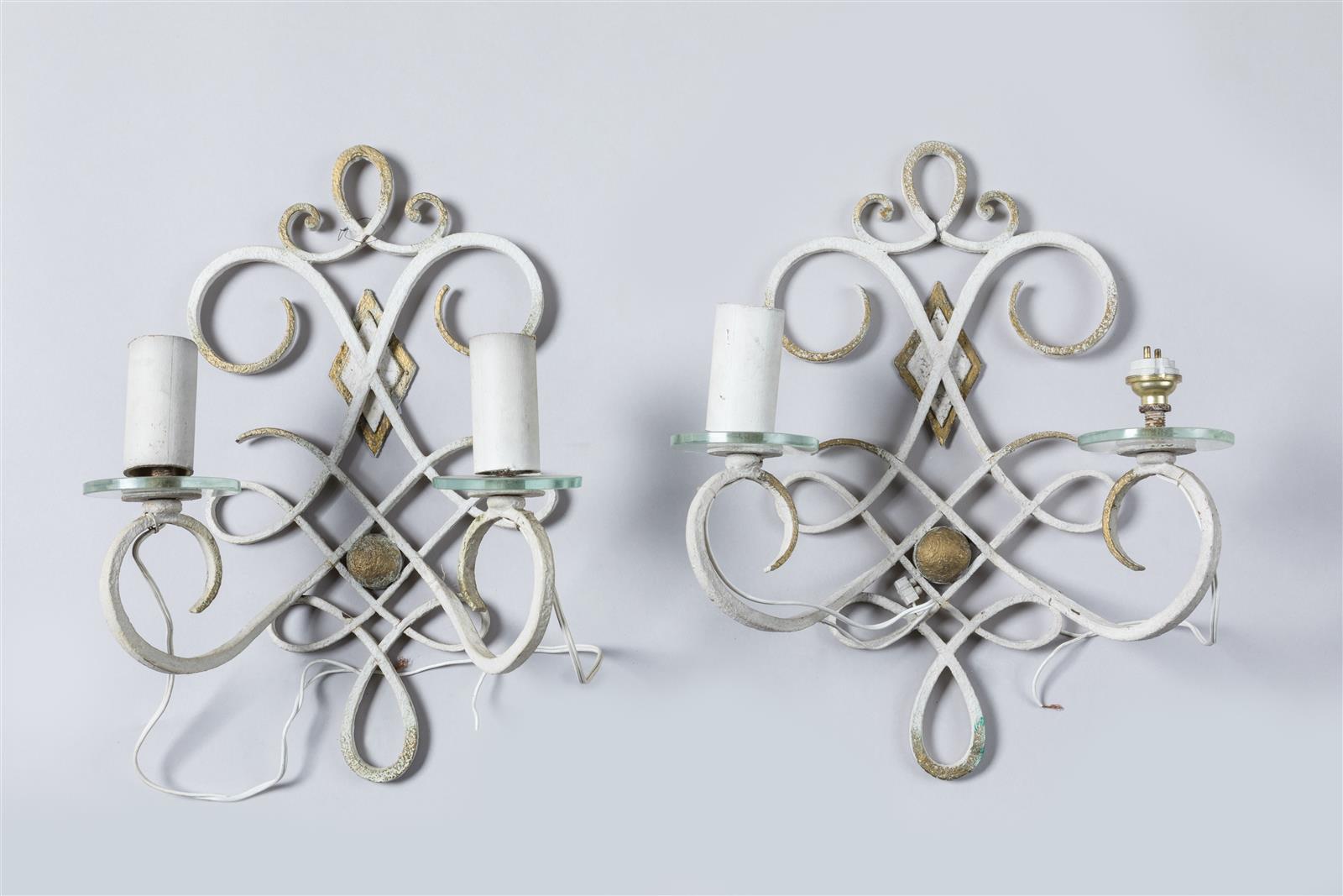 Attribué à Charles PIGUET - Paire d'APPLIQUES à deux lumières en fer forgé peint en blanc et doré, à décor d'entrelacs. H. 38 cm.