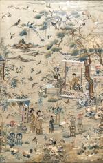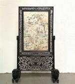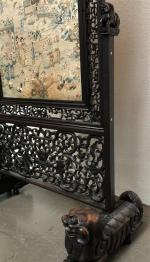 Ecran en soie brodée à décor de personnages dans des paysages arborés avec pagodes, vases et barrières, enchâssé dans une monture en bois sculpté, mouluré et ajourée sur un piètement en chiens de Fô