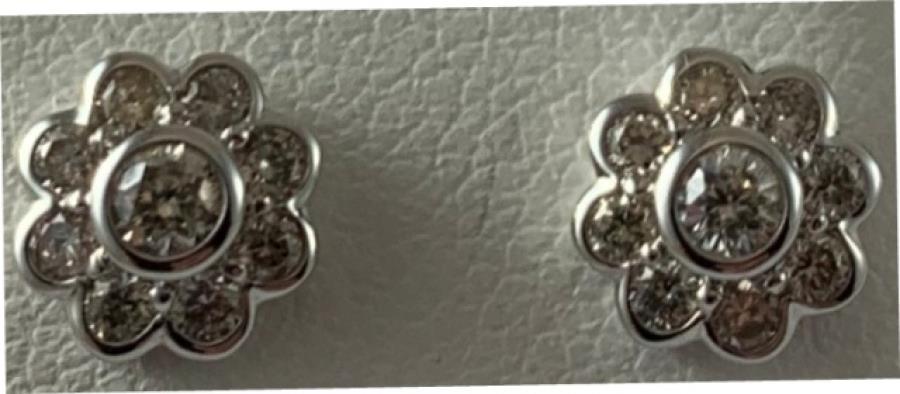 Paire de boucles d'oreilles Fleurs en or blanc ornées de 2 diamants ronds 0.10 carat dans un entourage de 16 diamants 0.25 carat. Fermoirs poussettes belges poids 1.3 g
