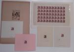 Timbre Mistral n°495, ensemble rare composé d'une feuille entière non dentelée (50 timbres N** TB, cote 2000 euros), de trois épreuves de luxe différentes (dont une verticale et une sur papier rose) et d'une épreuve d'artiste signée par Mazelin, le tout dans une pochette d'époque avec illustration de Mazelin imprimée sur la couverture. Une épreuve un peu pliée et deux épreuves légèrement frippées (en raison de la retractation des pochettes de présentation d'époque, conservées et livrées avec cet ensemble).