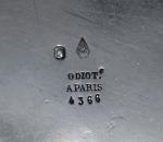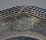 PLAT rond en argent, la bordure mouvementée moulurée de filets rubanés et feuillagés, l'aile gravée d'armoiries sous une couronne de comte Minerve. Orfèvre: ODIOT D.: 29 cm Poids: 634 gr