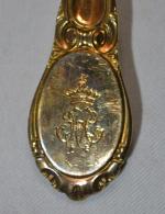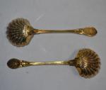Paire de CUILLERES A SAUPOUDRER en vermeil, chiffrées sous une couronne de comte Minerve. Orfèvre: Hippolyte THOMAS (1845-1855) L.: 21 cm Poids: 140 gr