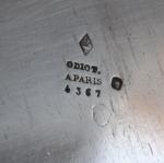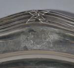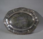 PLAT ovale en argent, la bordure mouvementée moulurée de filets rubanés et feuillagés, l'aile gravée d'armoiries sous une couronne de comte Minerve. Orfèvre: ODIOT 34 x 44 cm Poids: 1kg070