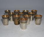 Suite de douze VERRES A LIQUEURS en argent, modèle à côtes torses Minerve. Orfèvre: A. VAGUER (1887-1920) H.: 4 cm Poids: 244 gr