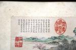 CHINE : Petite peinture d'album à l'encre et couleurs légères sur papier, représentant deux lettrés dans le pavillon d'une demeure nichée parmi les arbres, sur les berges d'un lac bordées de montagnes dans le lointain. Accompagnée d'un long poème sur le thème de l'hirondelle. Avec trois cachets apocryphes Qianlong et Jiaqing. Chine, XVIIIe-début XIXe siècle. (encadrée sous verre). Dim. 13,3 x 26,6 cm. Expert : Cabinet ANSAS-PAPILLON D'ALTON Tél. : 01 45 65 48 19