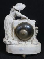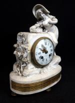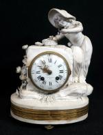Petite pendule d'époque Louis XVI en biscuit blanc représentant une jeune fille au nid d'oiseaux, mouvement et cadran postérieurs signés Ratel 53 rue Mr le Prince Paris. Haut : 27 cm (éclat réparé au cadran, petits manques à des fleurettes)