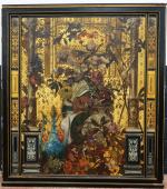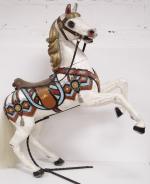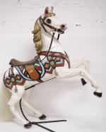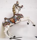 ART FORAIN : Cheval cabré de manège en bois sculpté peint blanc et polychrome, l'arrière de la selle sculpté d'un tête de lion, quelques éléments décoratifs en métal, harnais en cuirs, les yeux en verre, queue en fibre, sur support en fer forgé torsadé. Haut. : 1,43 m - Long. : 1,25 m (état d'usage, usures, fentes, etc...)