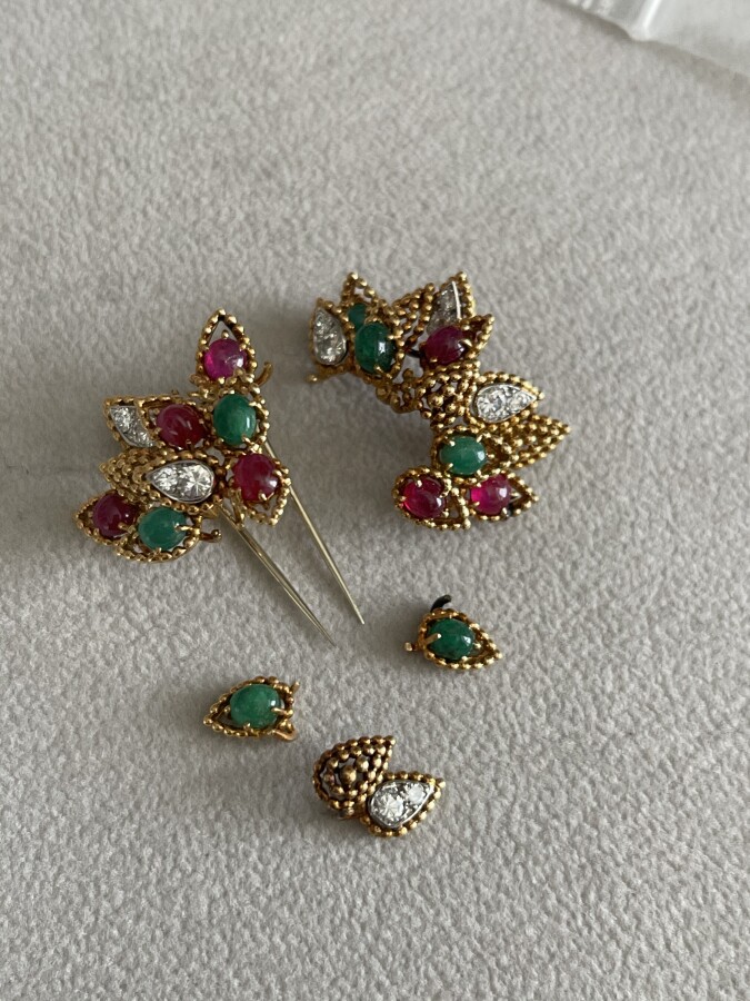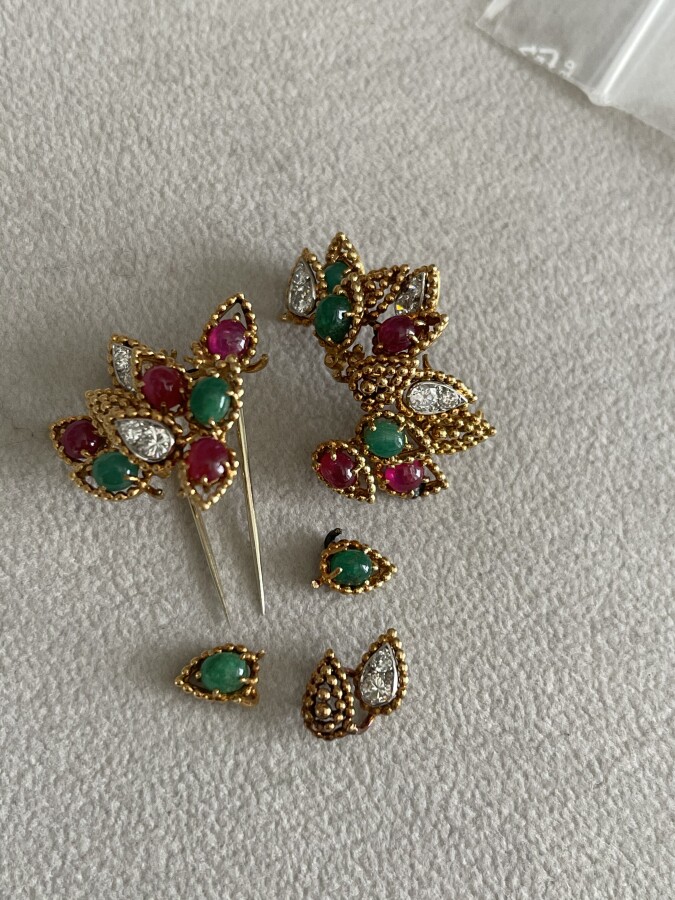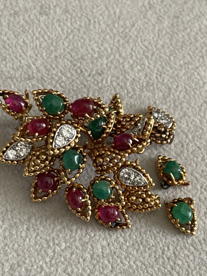 VAN CLEEF and ARPELS CLIP en or jaune serti de cabochons d'émeraudes, rubis et diamants poids 16.3 g (cassé)