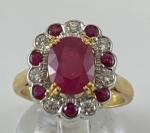 BAGUE ovale festonnée or 2 tons centre Rubis taille ovale pesant 2.60 carats dans un entourage de 7 diamants ronds intercalés de 7 petits rubis, poids 5g7, TDD : 53