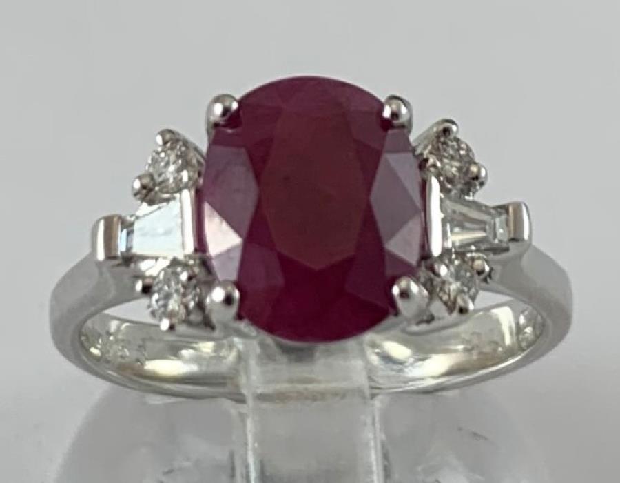 BAGUE en or blanc ornée d'un Rubis de taille ovale 2.89 carats dans un entourage de diamants ronds et baguette TDD : 52.5, poids 3g8 Certificat GGT 11090182