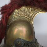 Casque de carabinier époque Second-Empire, modèle 1858 (daté 1867) et poinçonné de DELACHAUSSEE, la bombe à cimier à décor de feuilles de laurier, paire de jugulaires à gourmettes et cuir sur rosaces argentées étoilées, bandeau en fer frappé de la grenade en laiton, chenille en crin rouge (usée), la coiffe intérieure en cuir, estampille de Delachaussée sur la nuquière (usures).